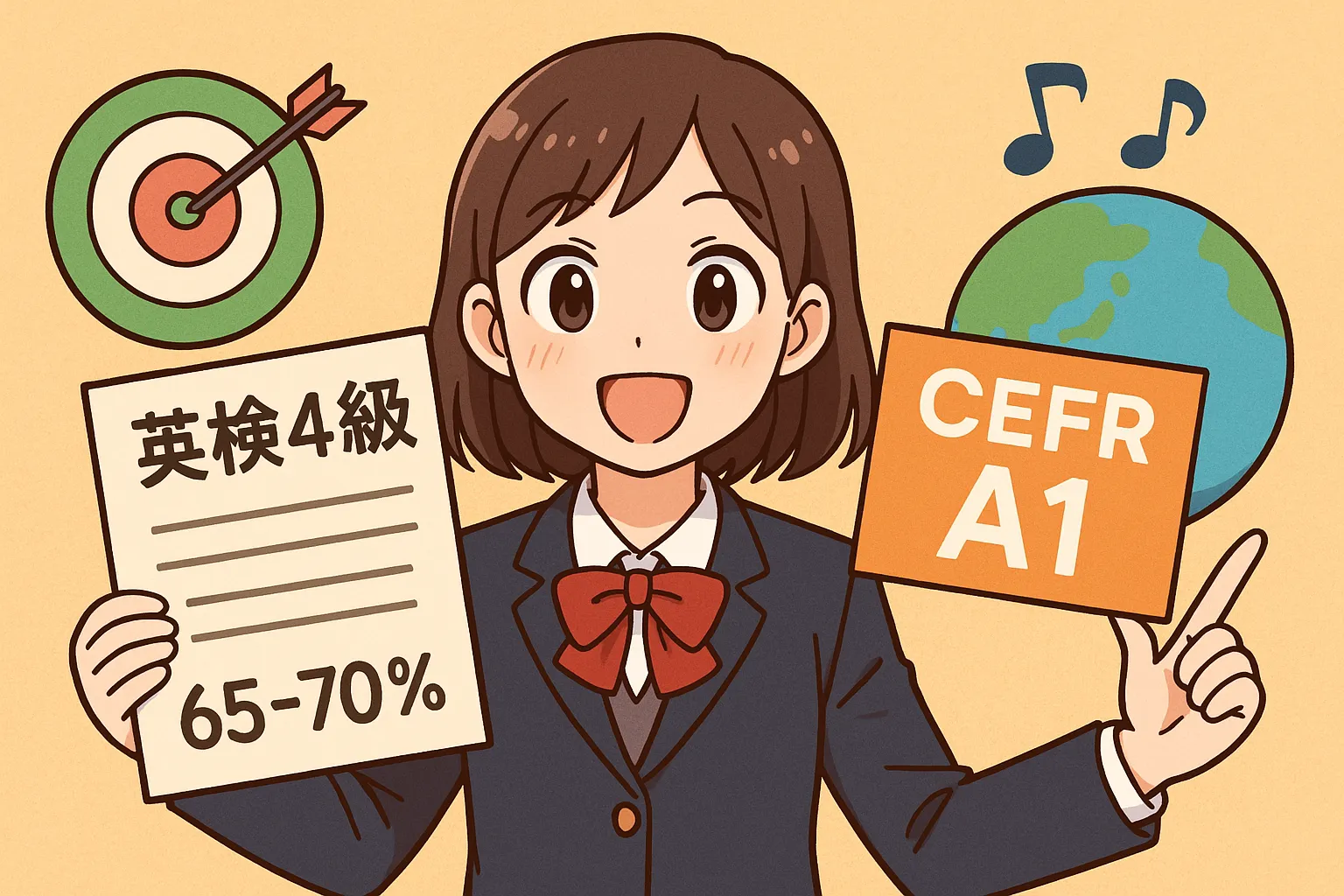 英検4級は、中学中級レベル(CEFR A1程度)に相当します。