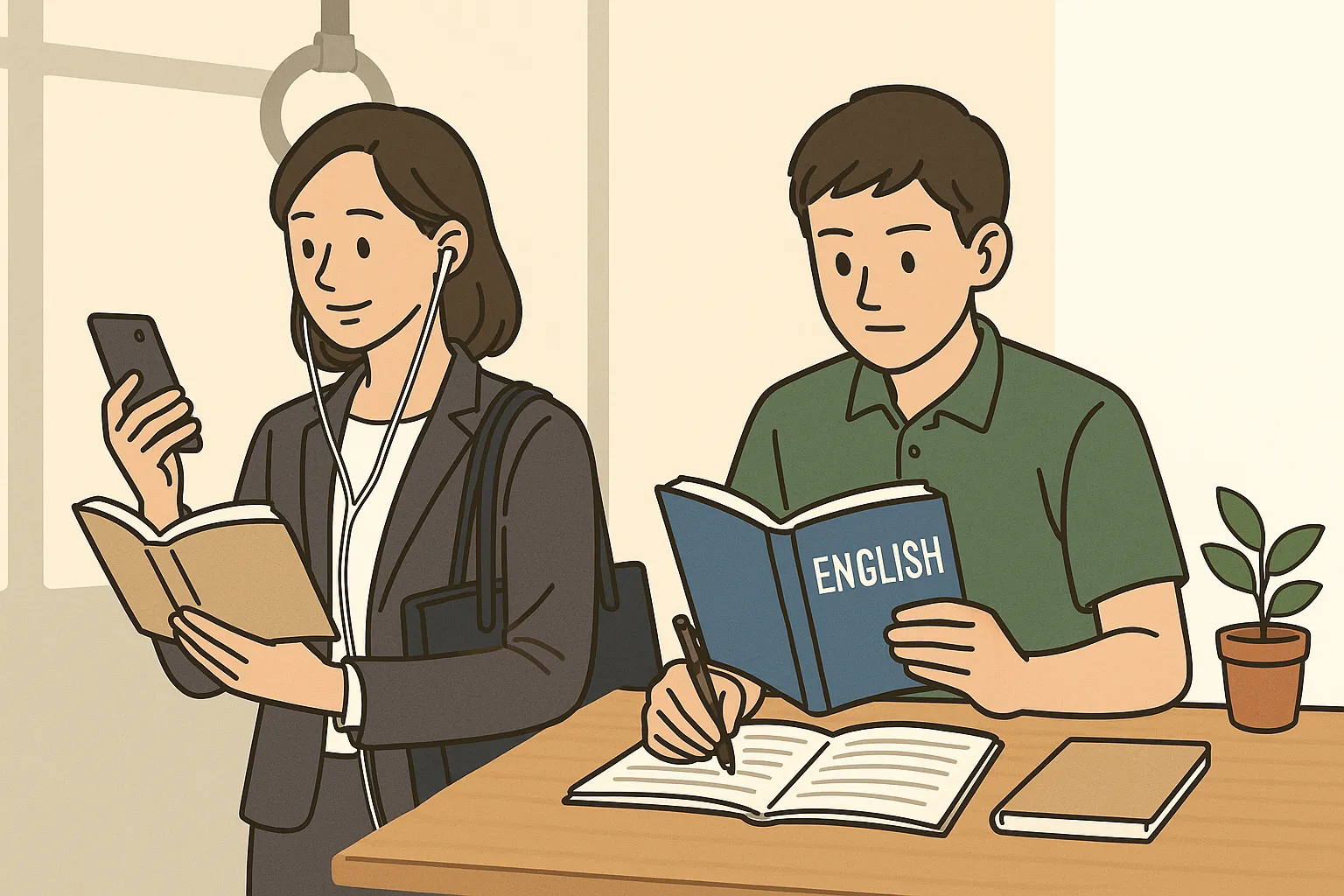 忙しい社会人の方には、通勤中+寝る前5分の2本立てが効果的。